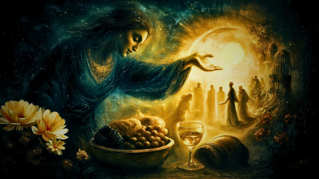 Picture yourself in a wide, sunlit meadow. Around you, the Earth has set a table: flowers, fruits, bread still warm from the oven, cool water flowing nearby.