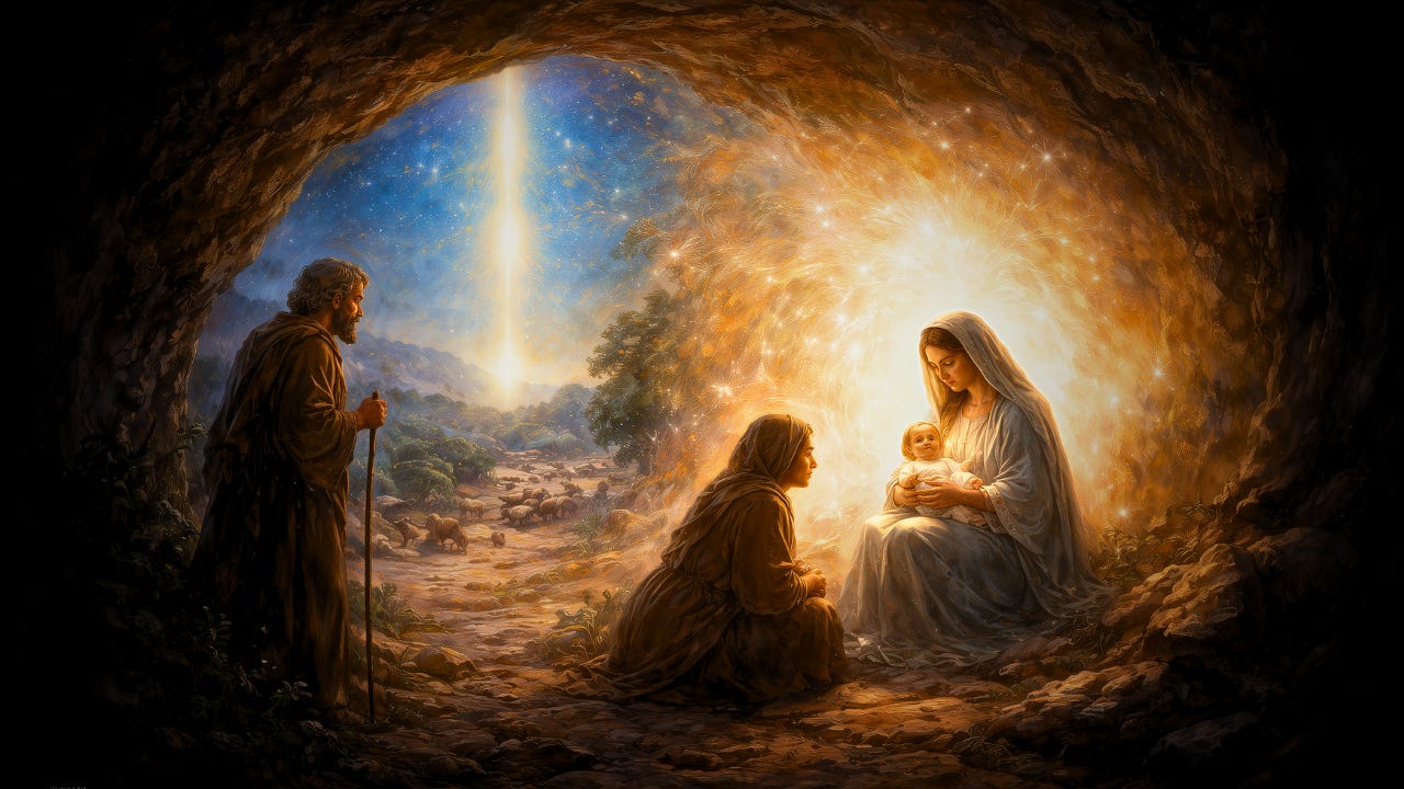 Joseph invited Salome into the great walk without walking that he was doing, and as they returned to the cave, her eyes are opened. But unlike Joseph, who saw the splendor, the Shekinah, the glory of God in the sky, she sees the great cloud of unknowing in the cave.